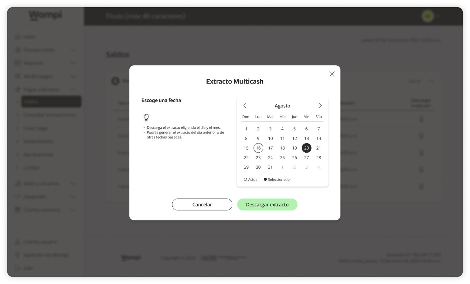 A Multicash statement is a consolidated report that lets you view the movements and balances of your bank accounts linked to Wompi’s Payouts.