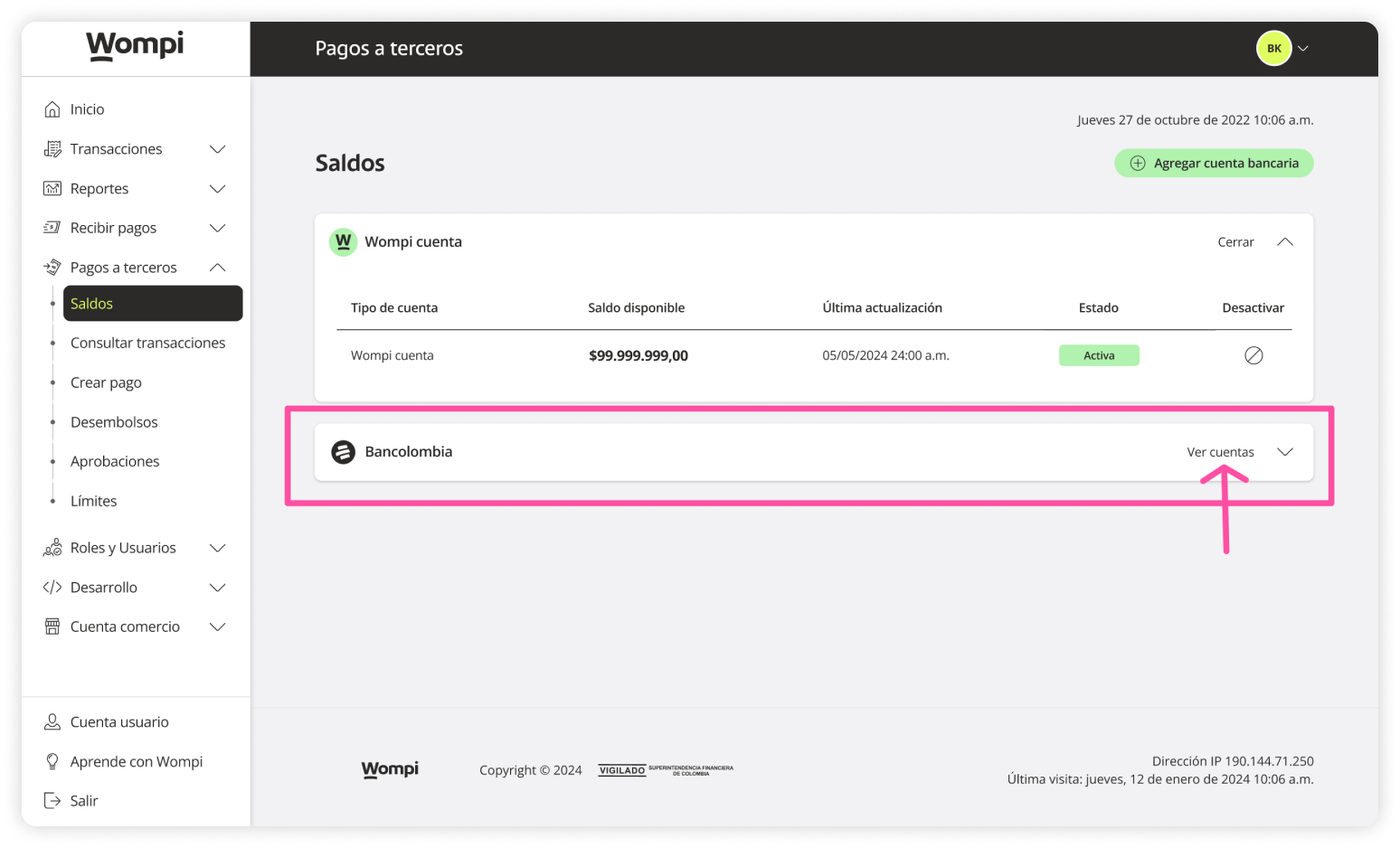 Reminder: The Wompi account is a digital account that uses the balance from the 'Wompi Online Payments' product.