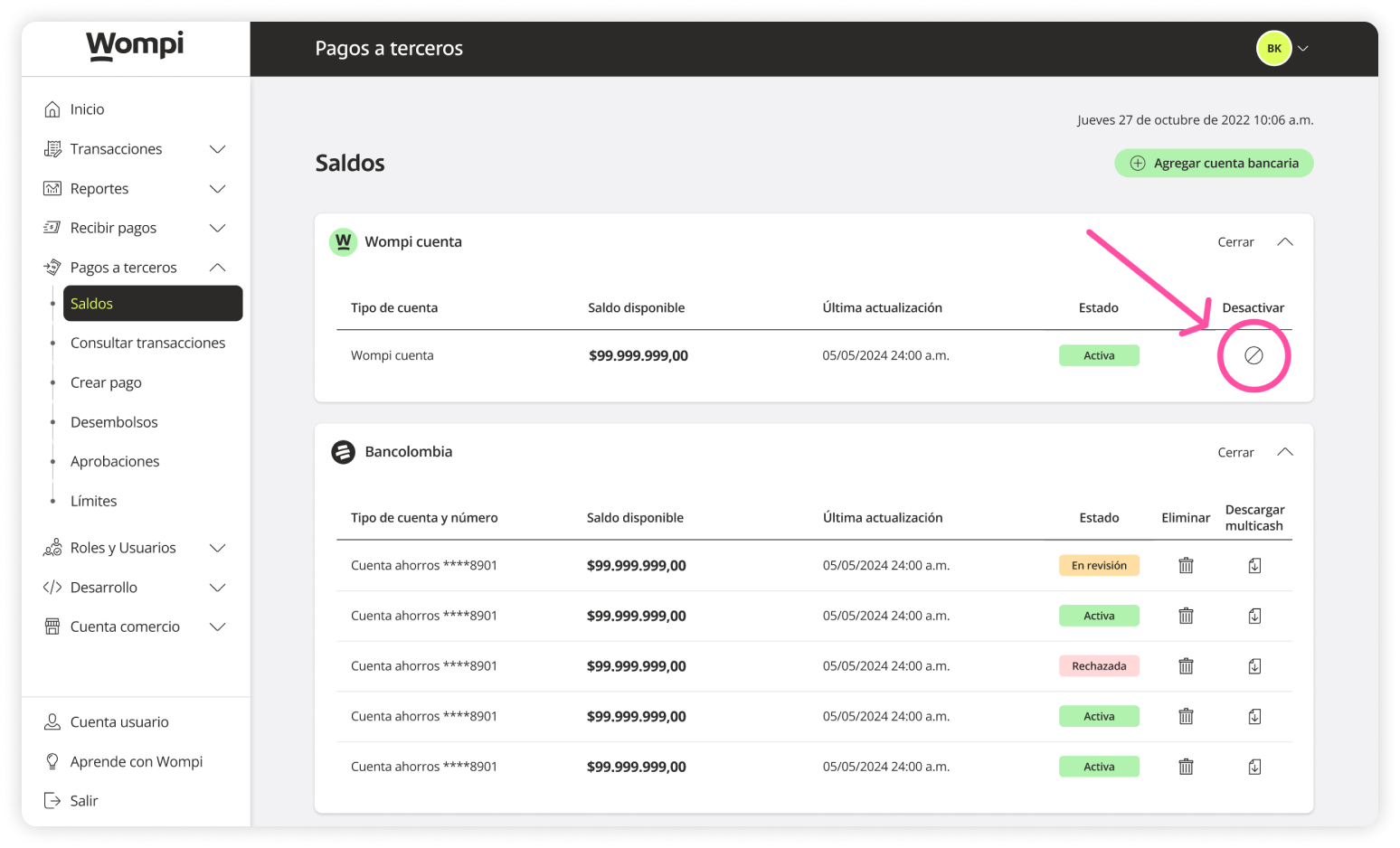 In the Balances section > Wompi Account, click the ‘Deactivate’ icon.