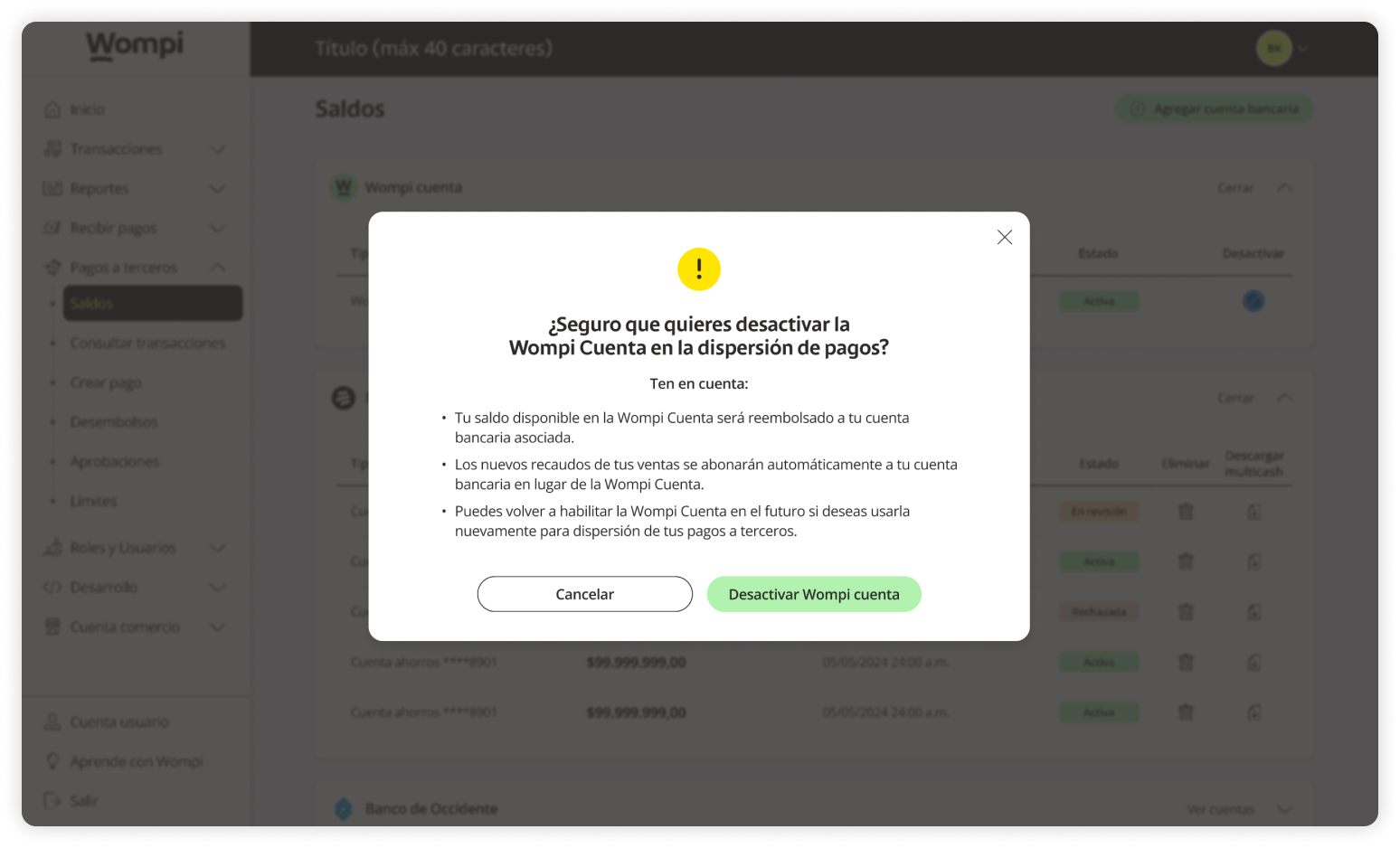 - You can reactivate the Wompi account later if you want to use it again for payouts.
