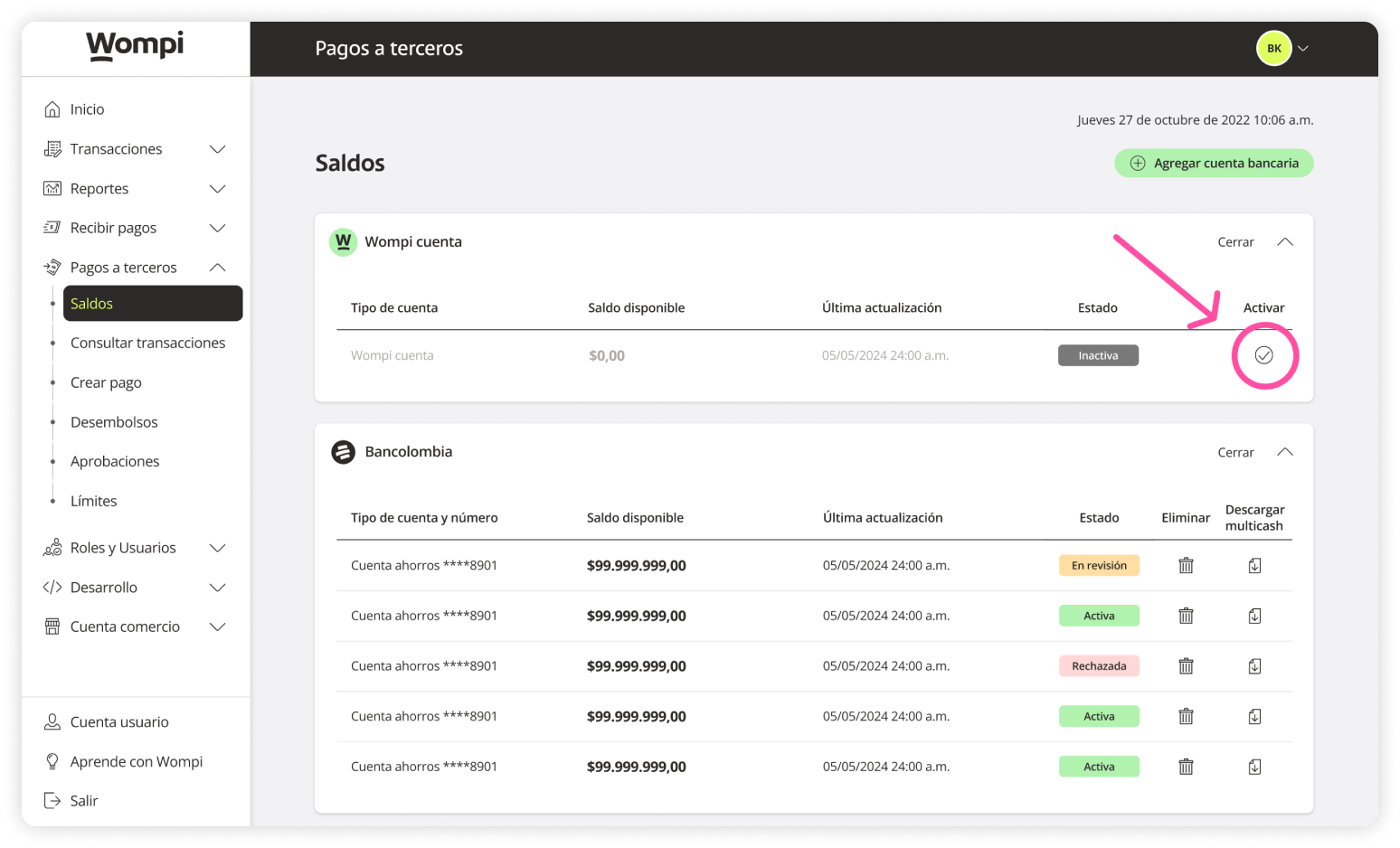 Once activated, the Wompi account will change to an ‘Active’ status and be available again as a payout option.