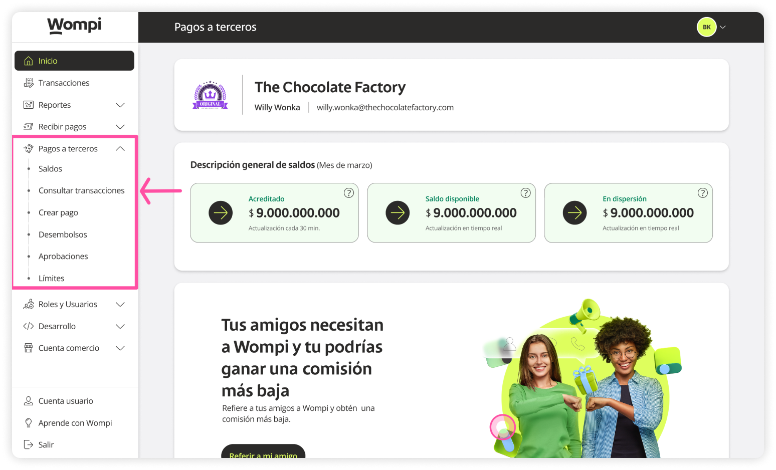 Once inside the Wompi dashboard, expand the Payouts menu on the left and select View transactions.