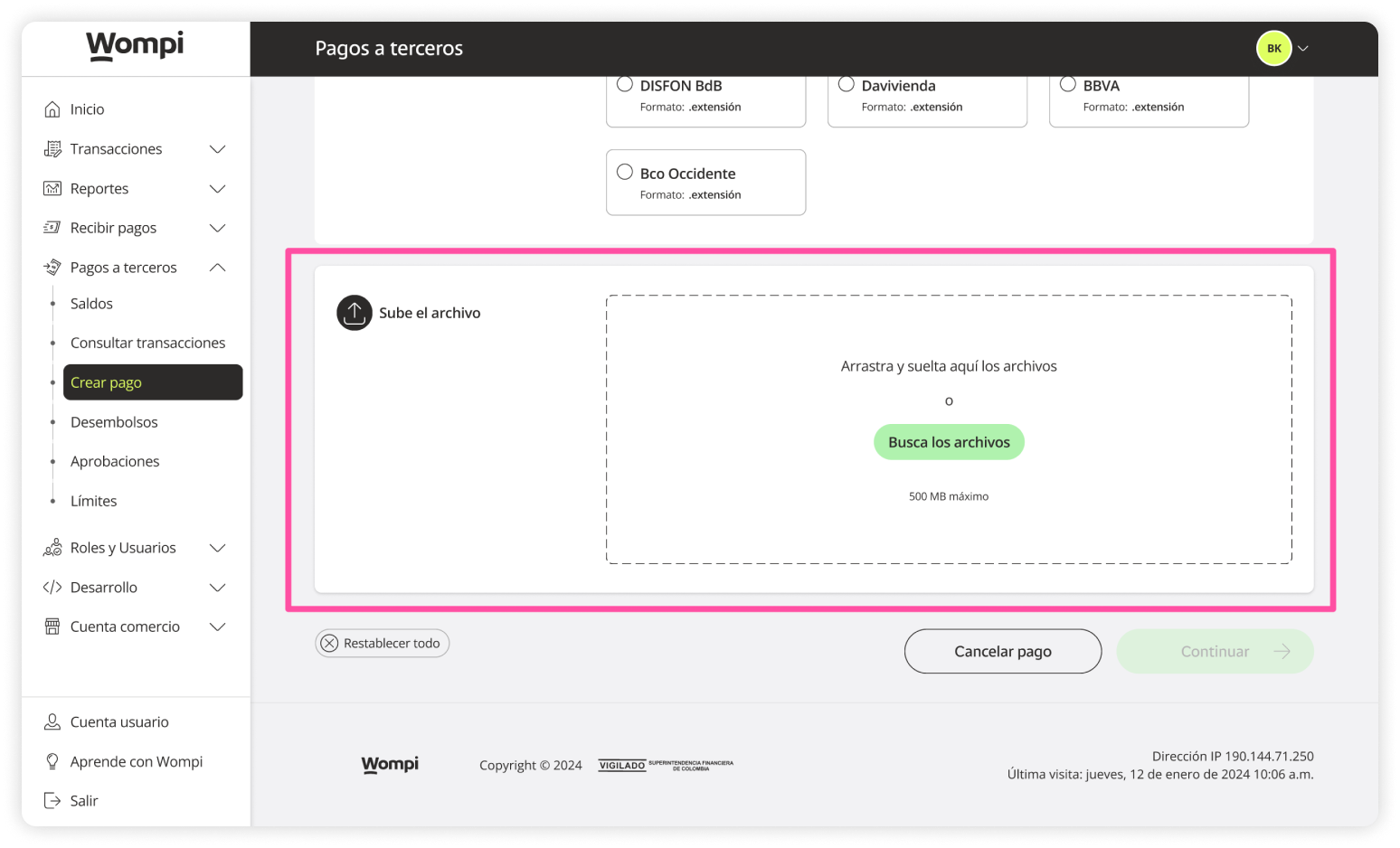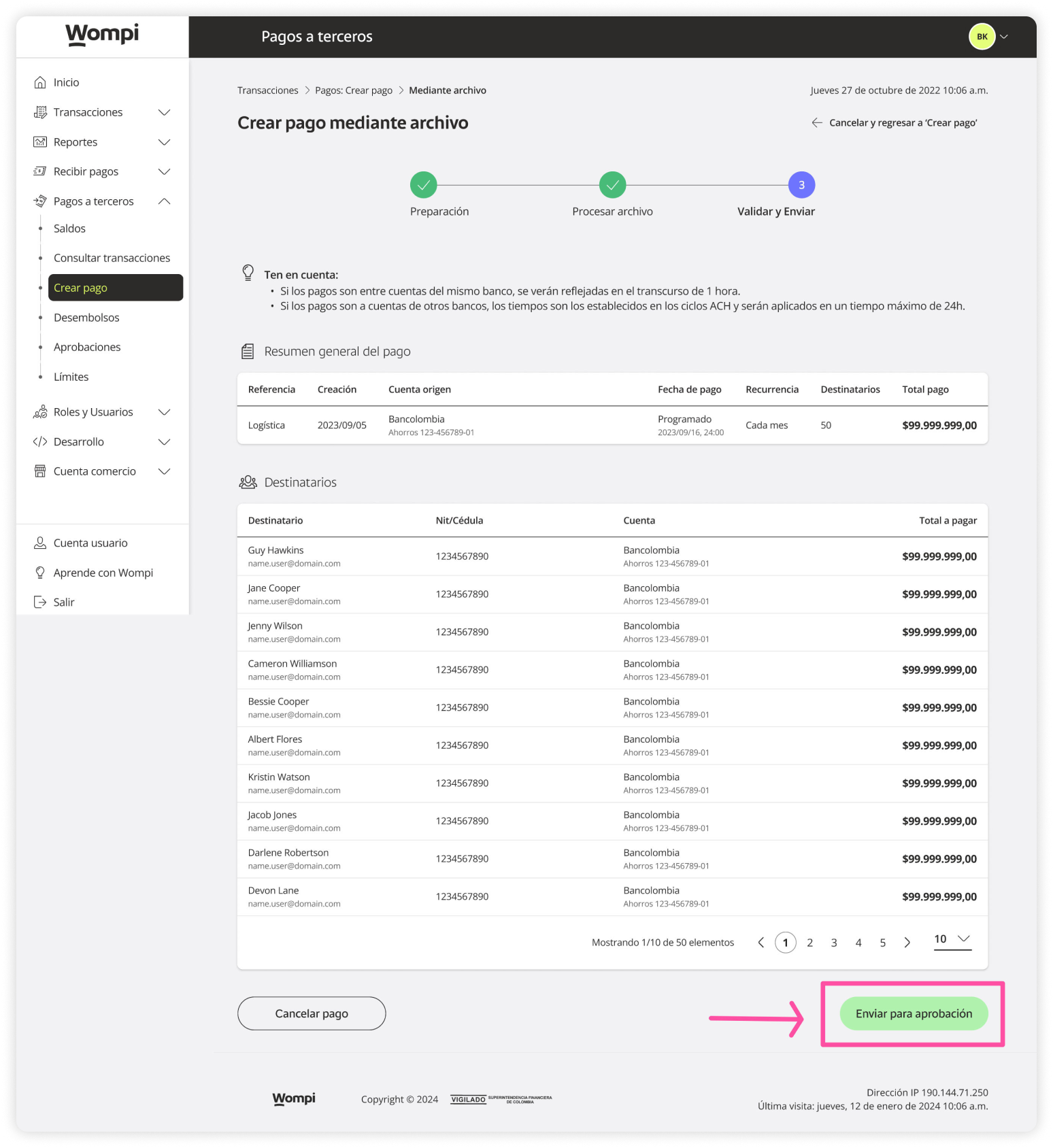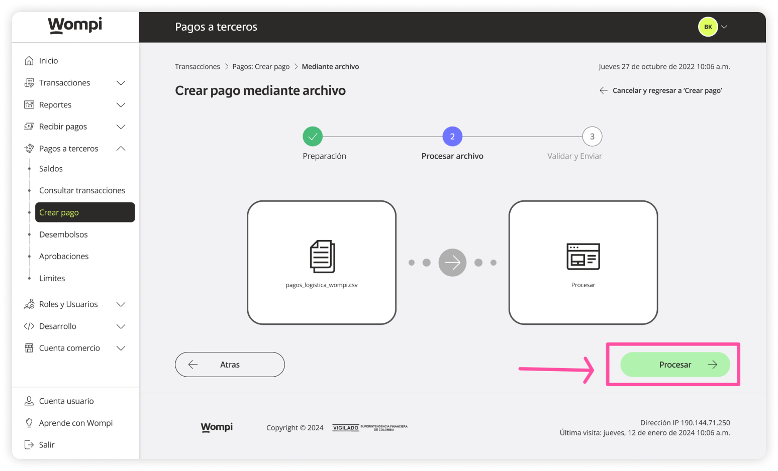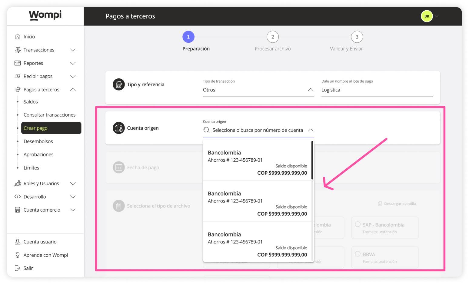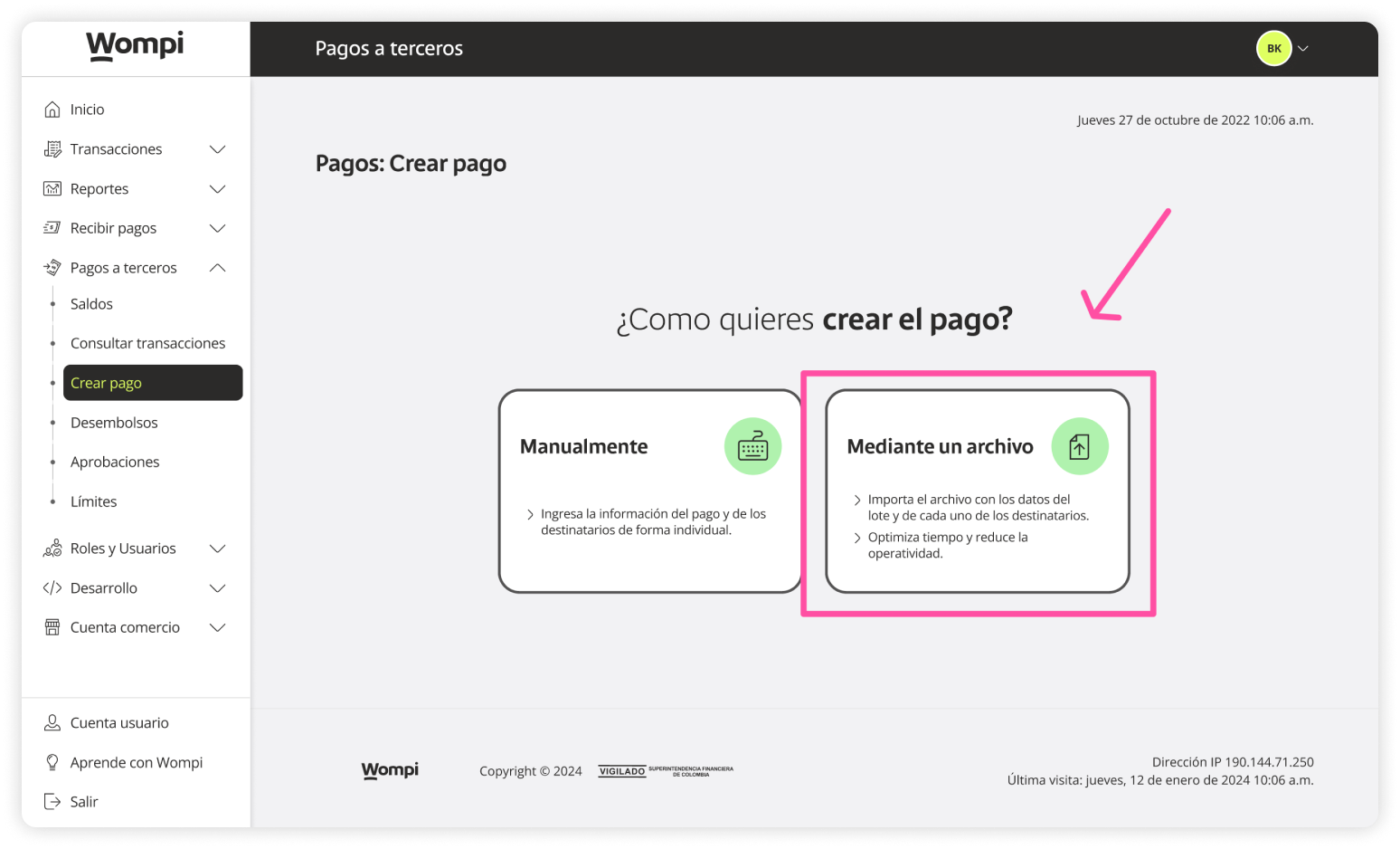 Once inside the Wompi dashboard, in the left menu expand the Payouts button and select the Create payout option.