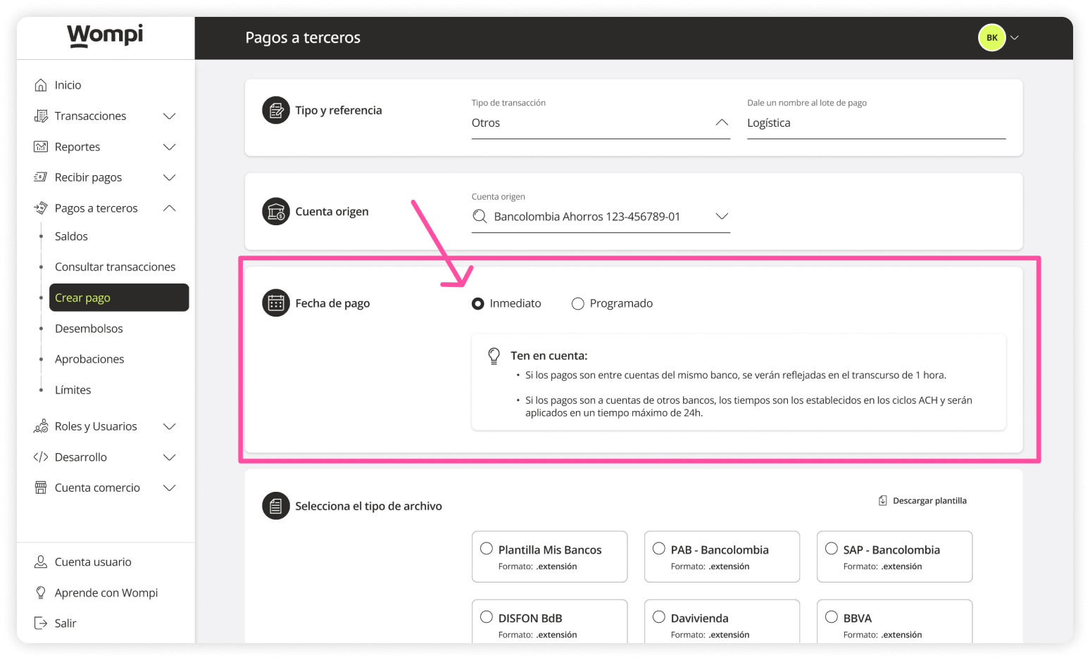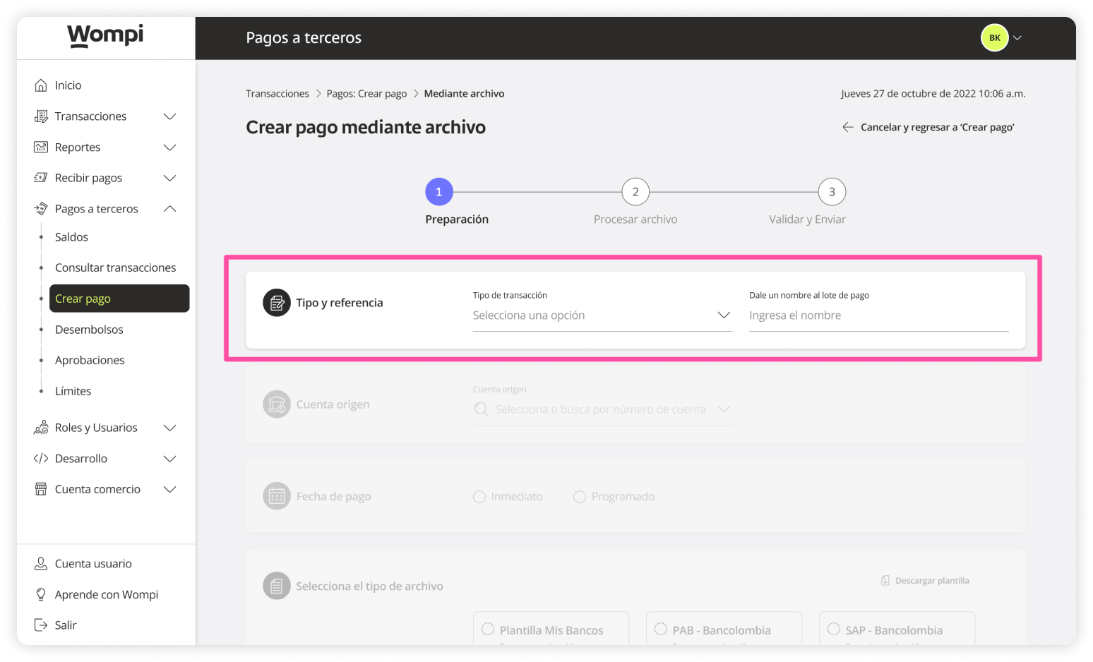 - Type and reference: Select the type of transaction (Payroll, Suppliers, Others) and assign a name to the payout.