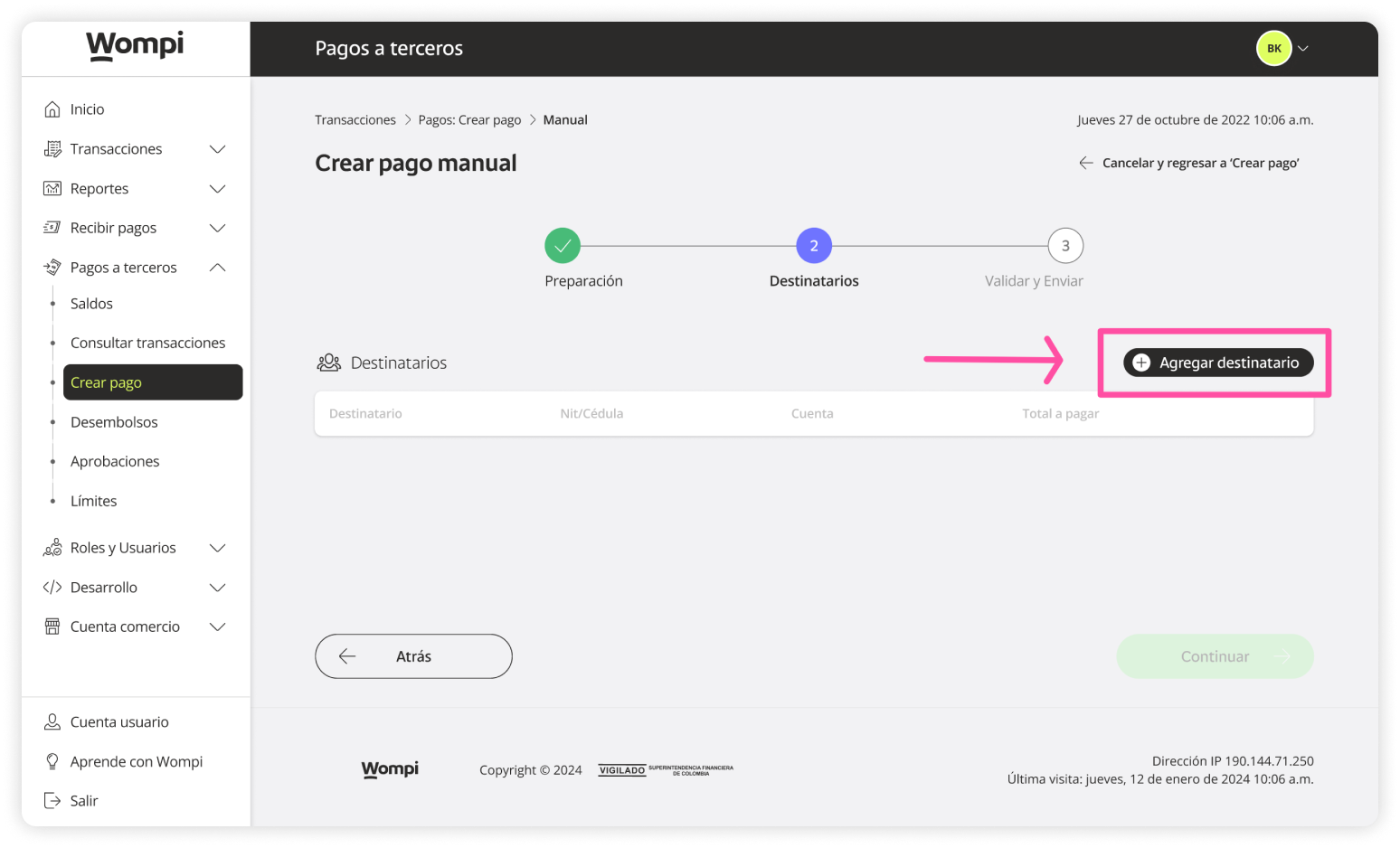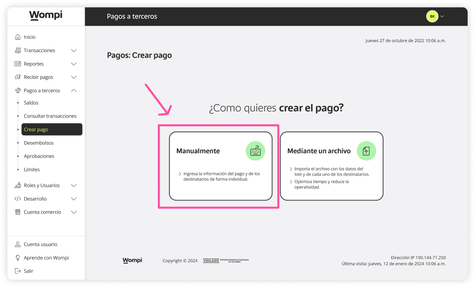 Once inside the Wompi dashboard, in the left menu expand the Payouts button and select the Create payout option.