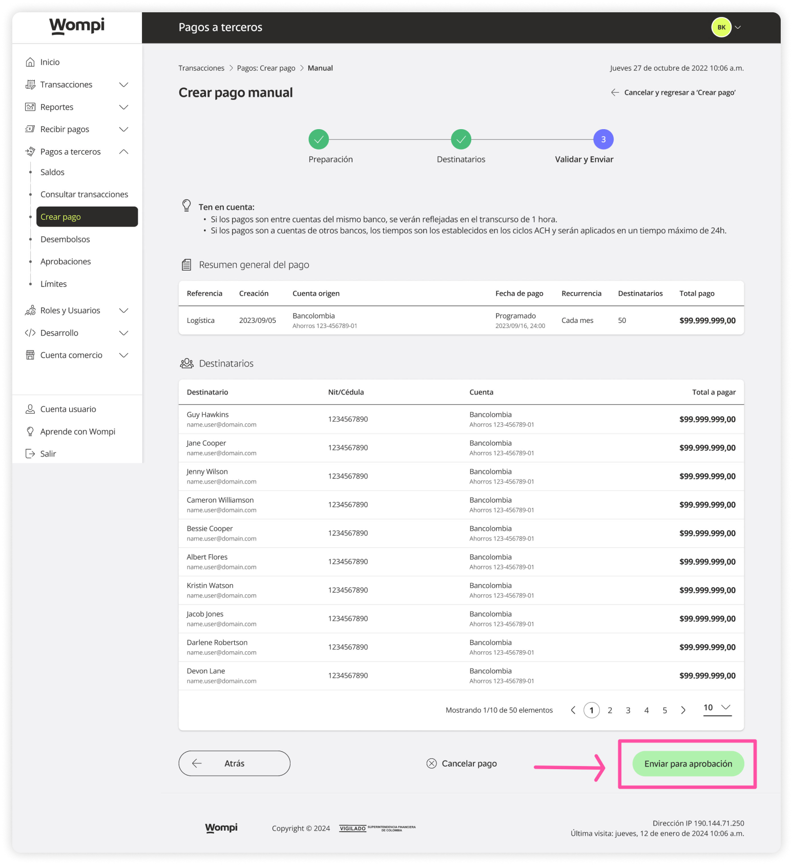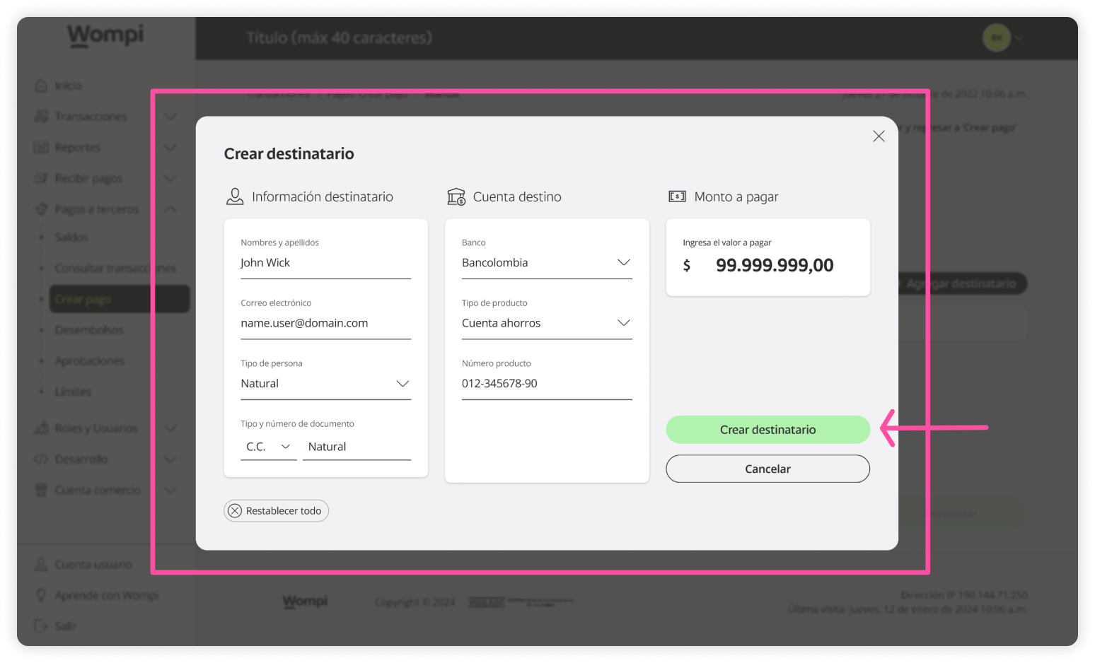 Enter the Recipient information (Full name, email, person type, ID type and number), Destination account (Bank, account type, account number), and Amount to pay.