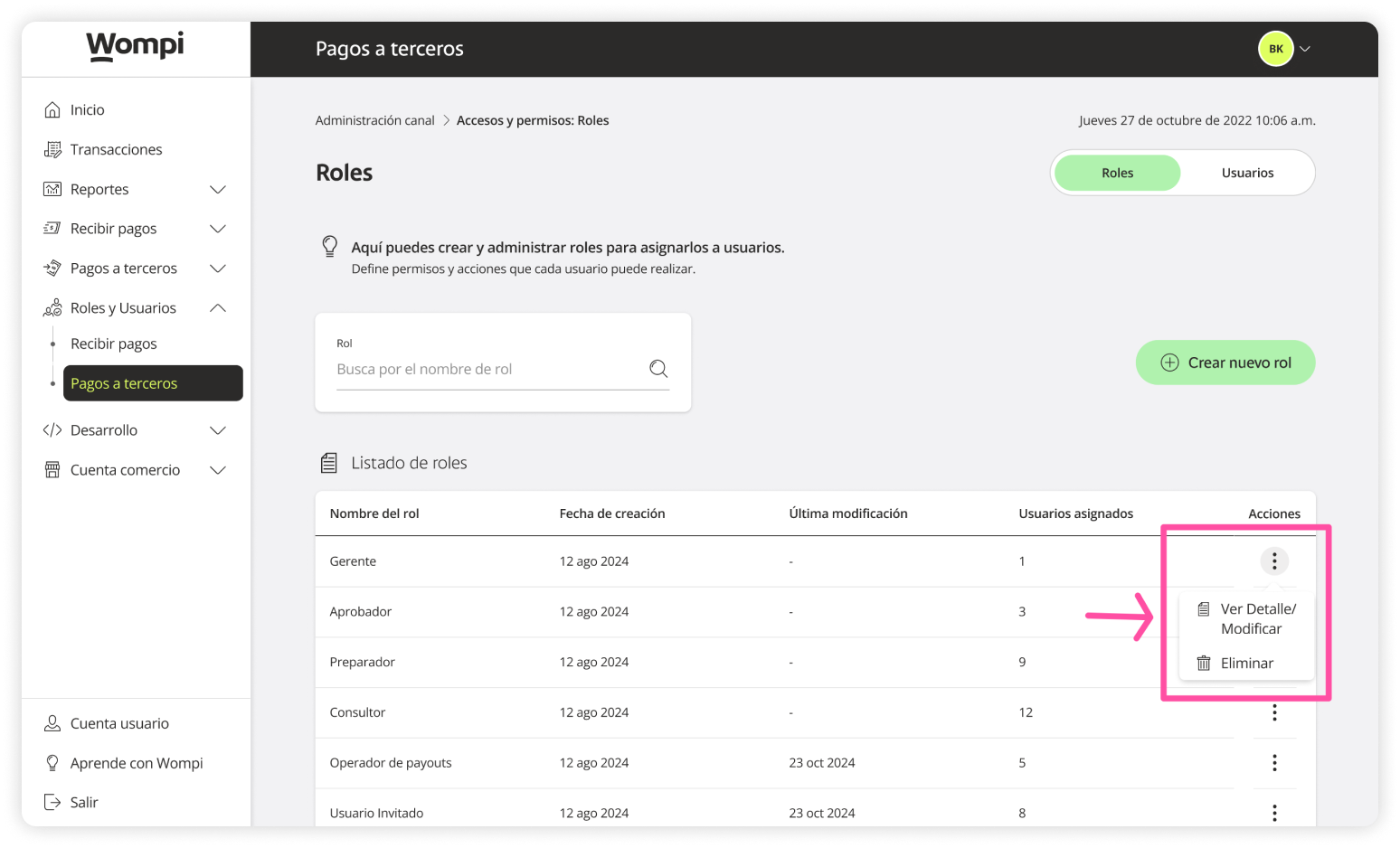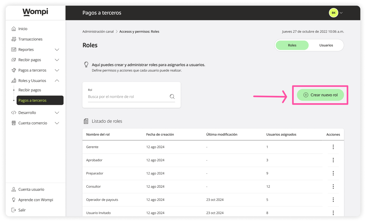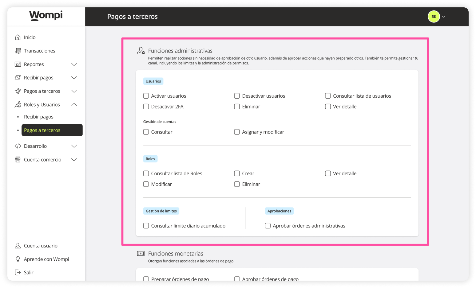 Once inside the Wompi dashboard, expand the Roles and Users menu from the left sidebar and select Third-party payments.