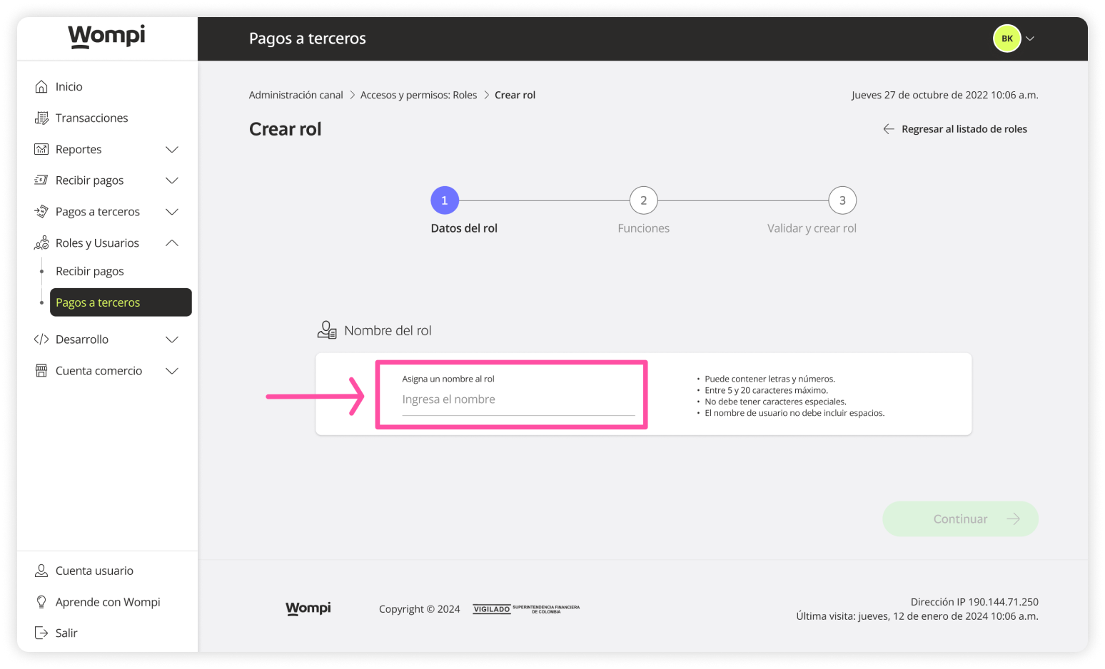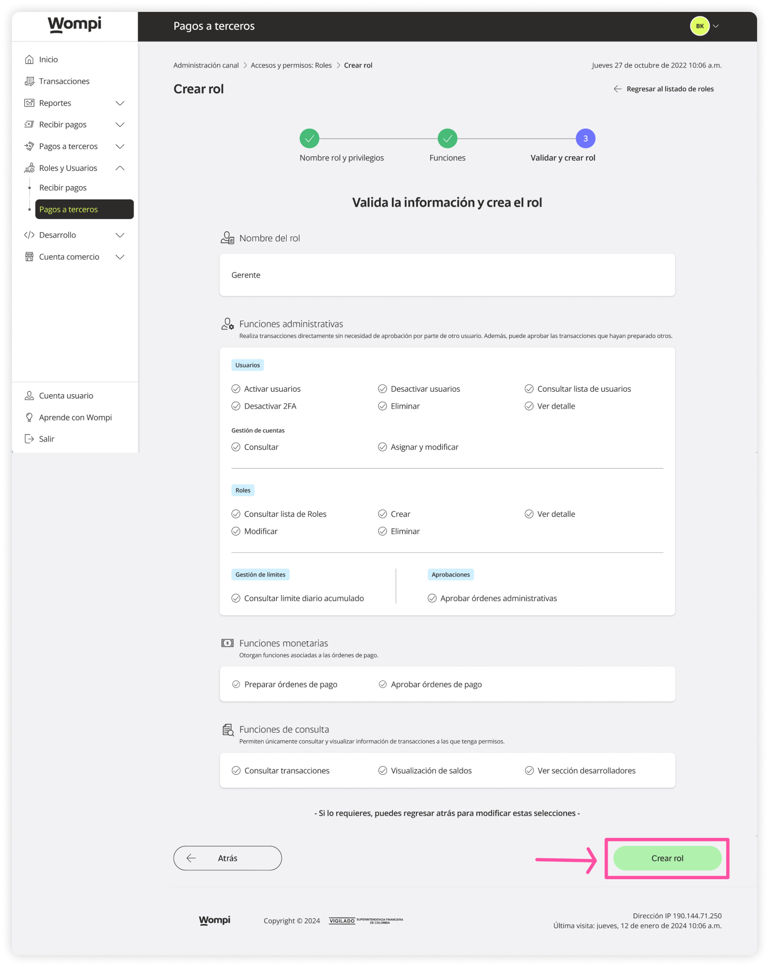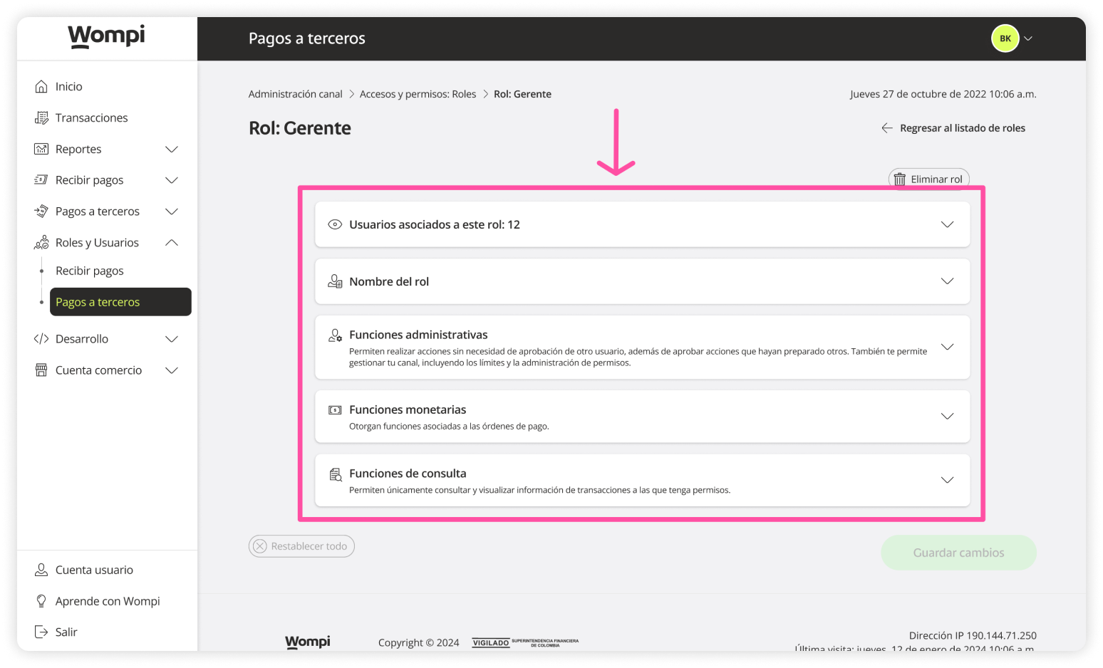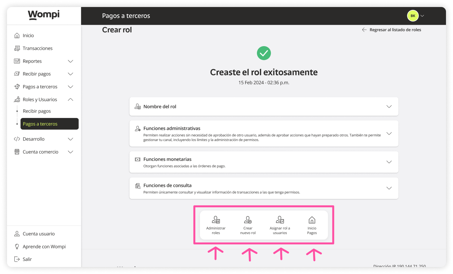 Once inside the Wompi dashboard, expand the Roles and Users menu from the left sidebar and select Third-party payments.