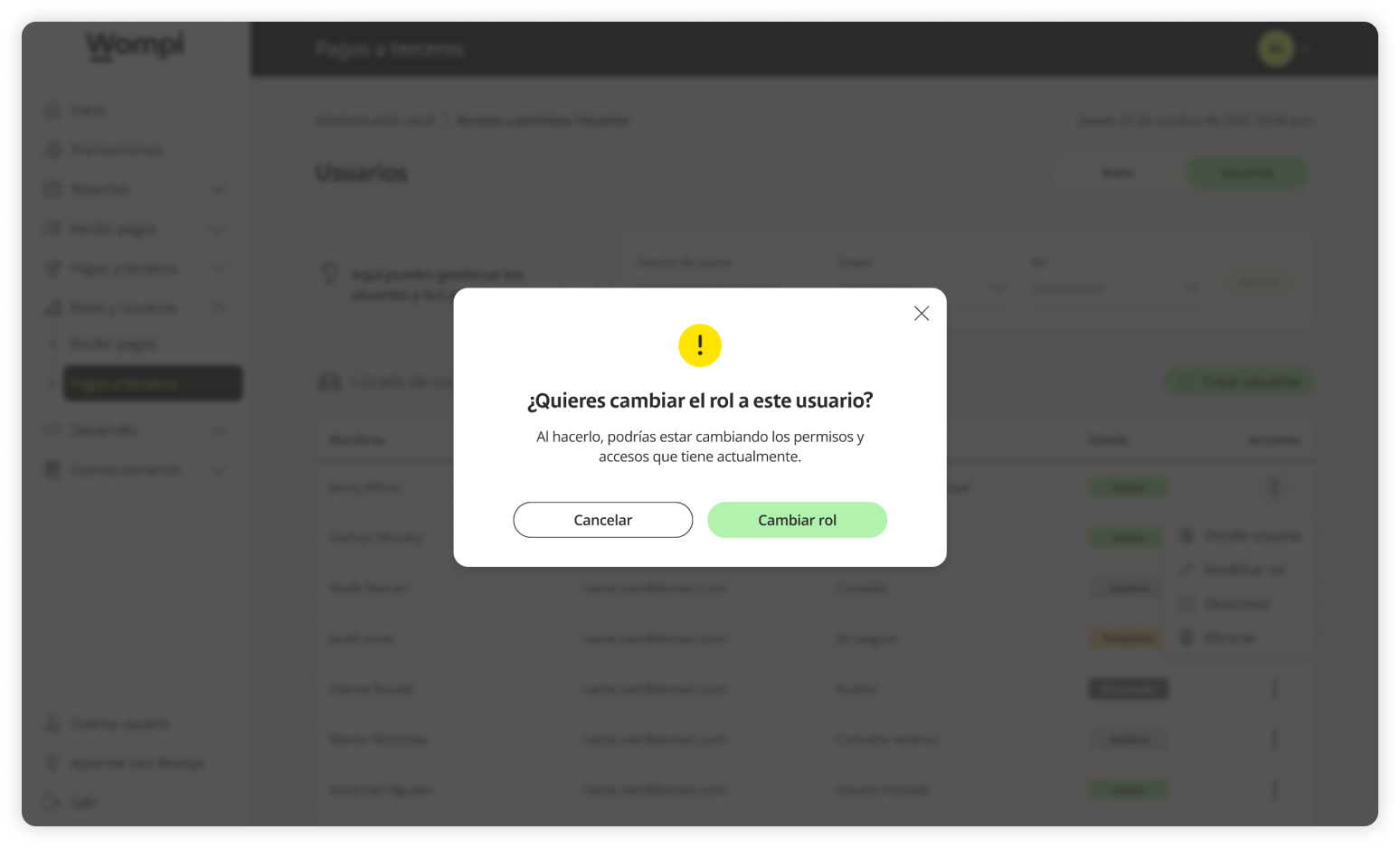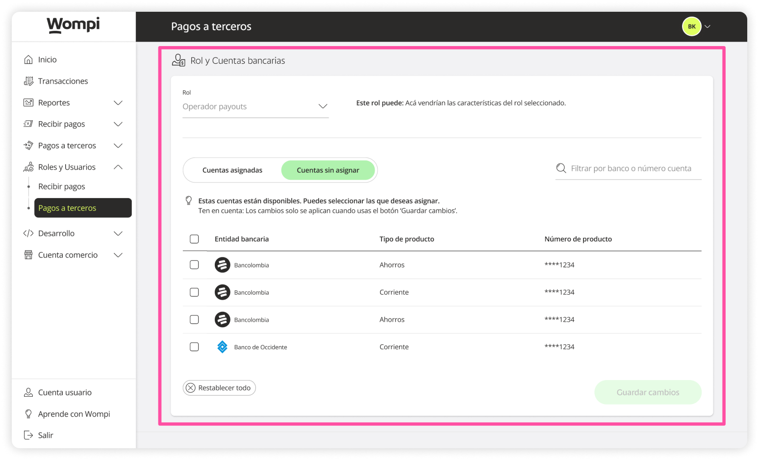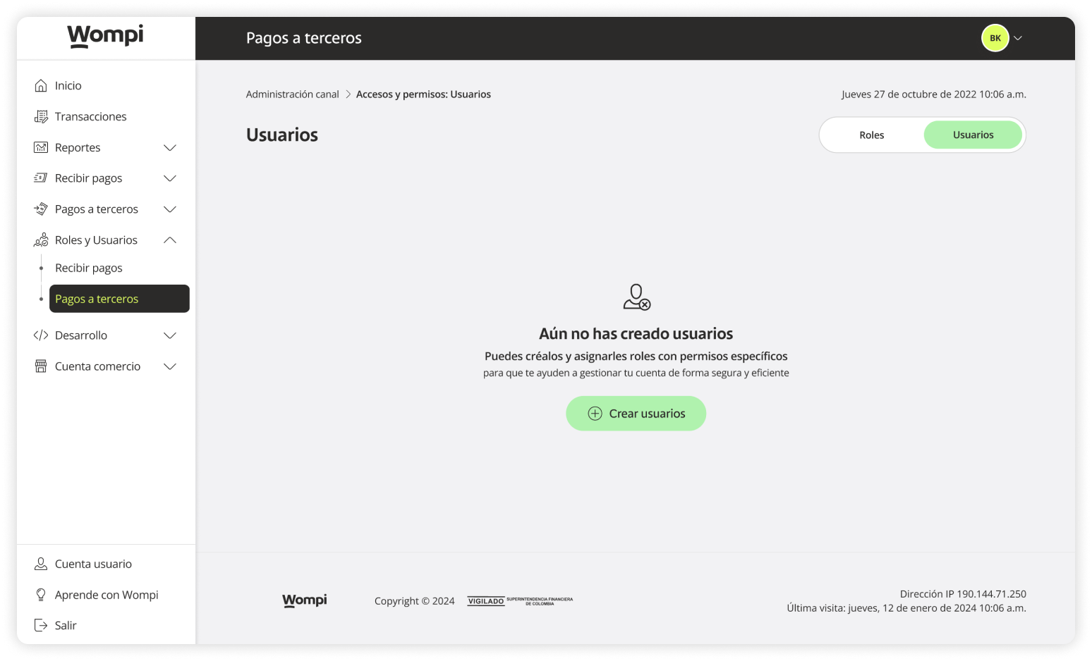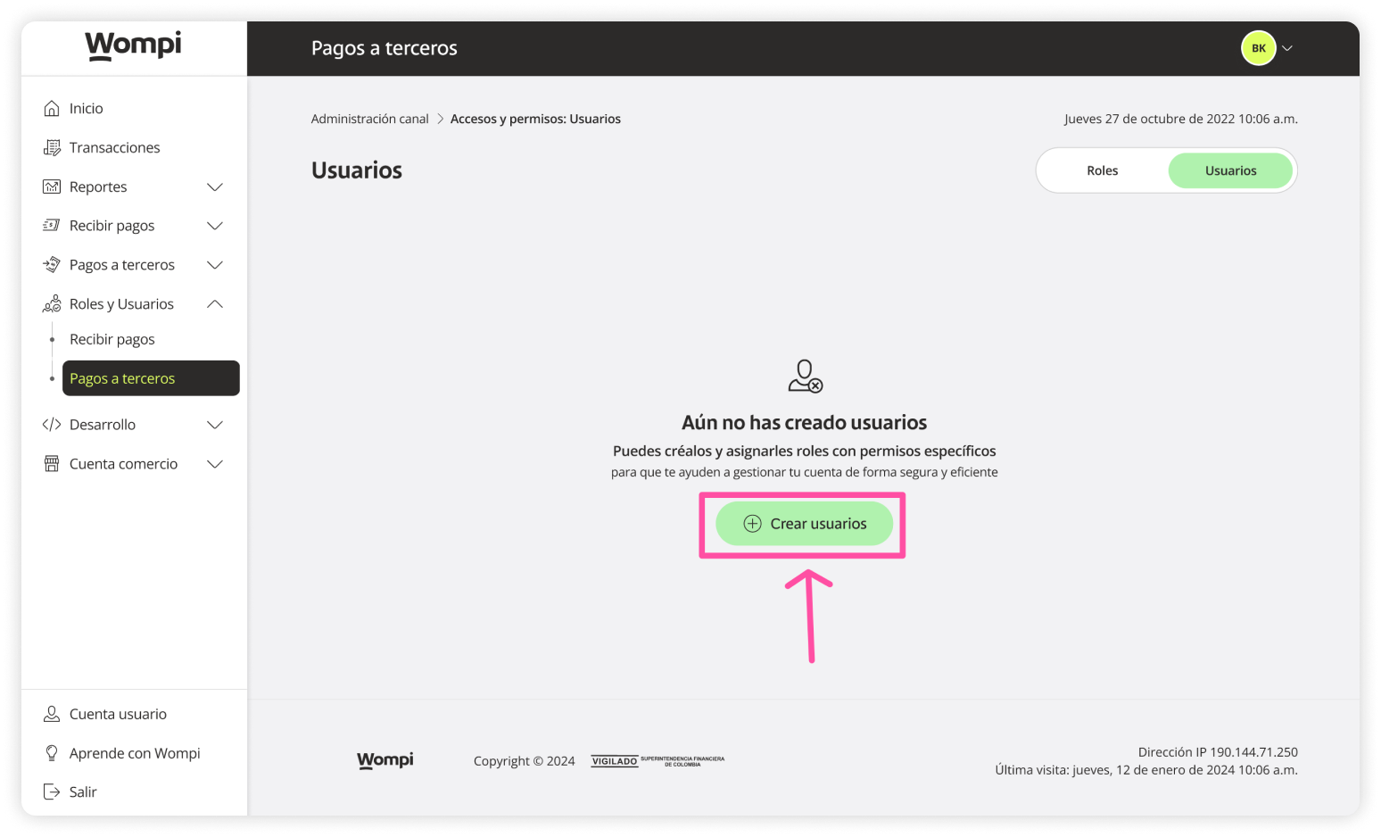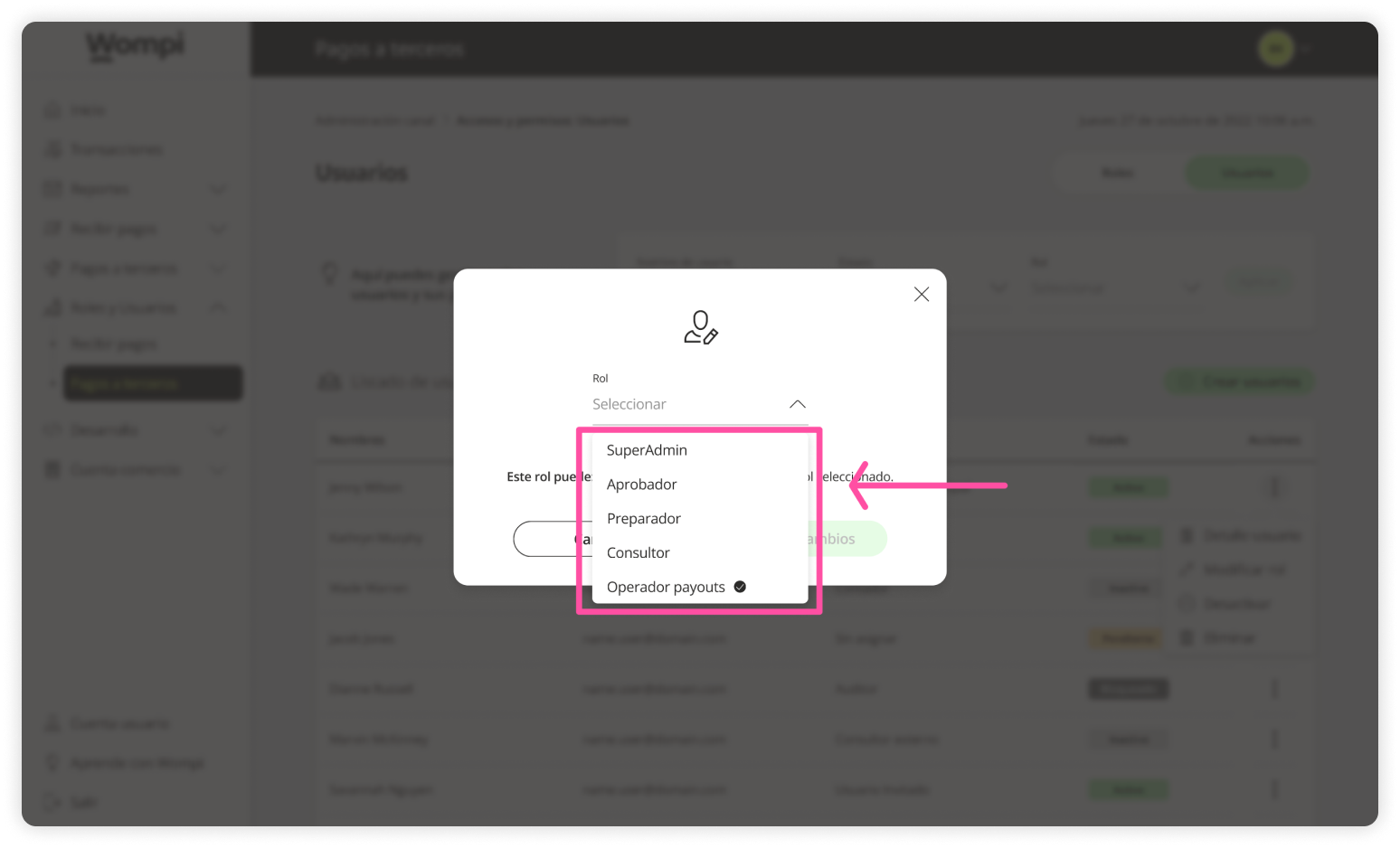 When you access the Wompi dashboard, open the Roles and Users section from the left menu and select the Payouts option.