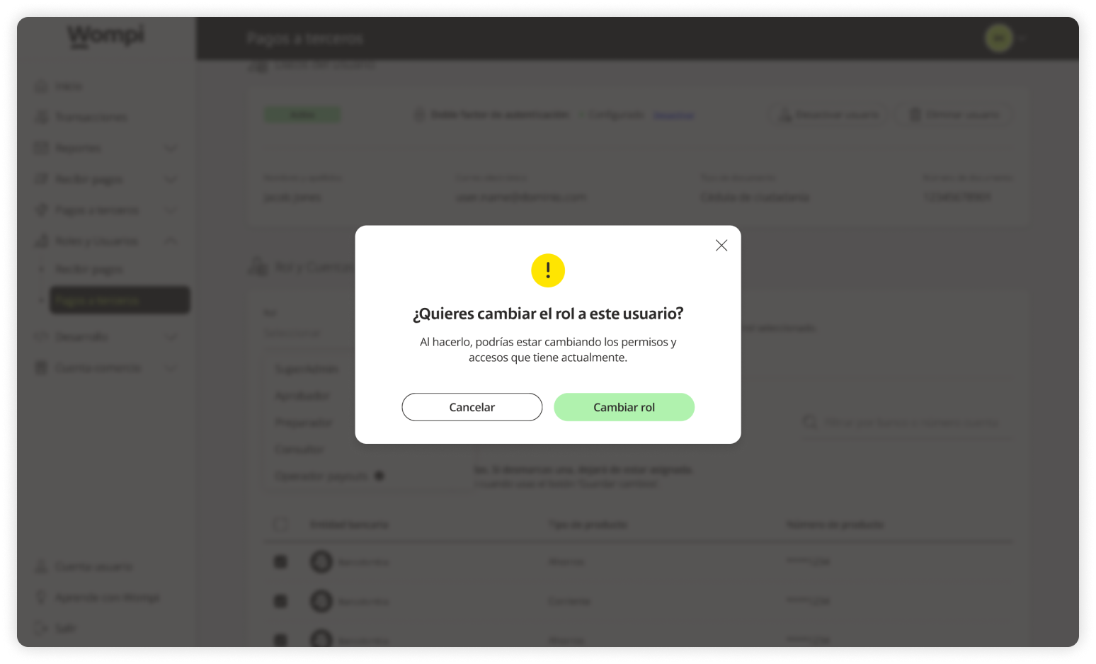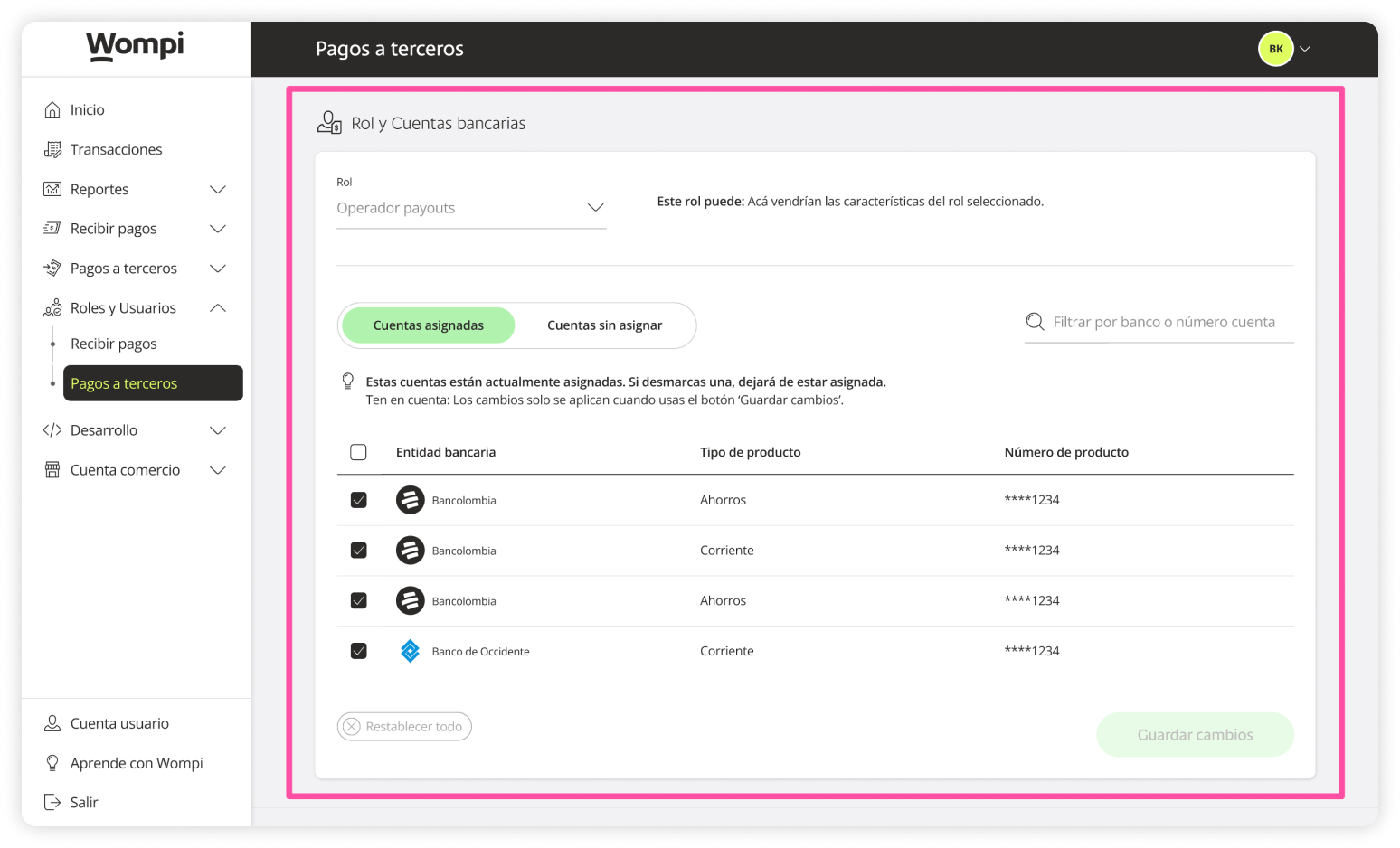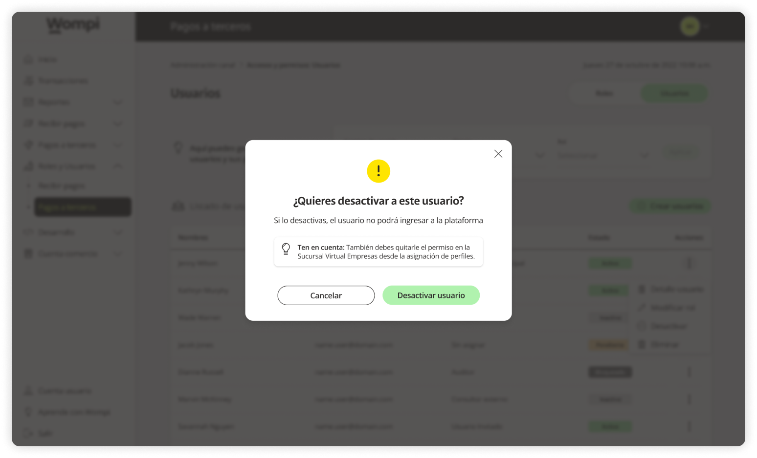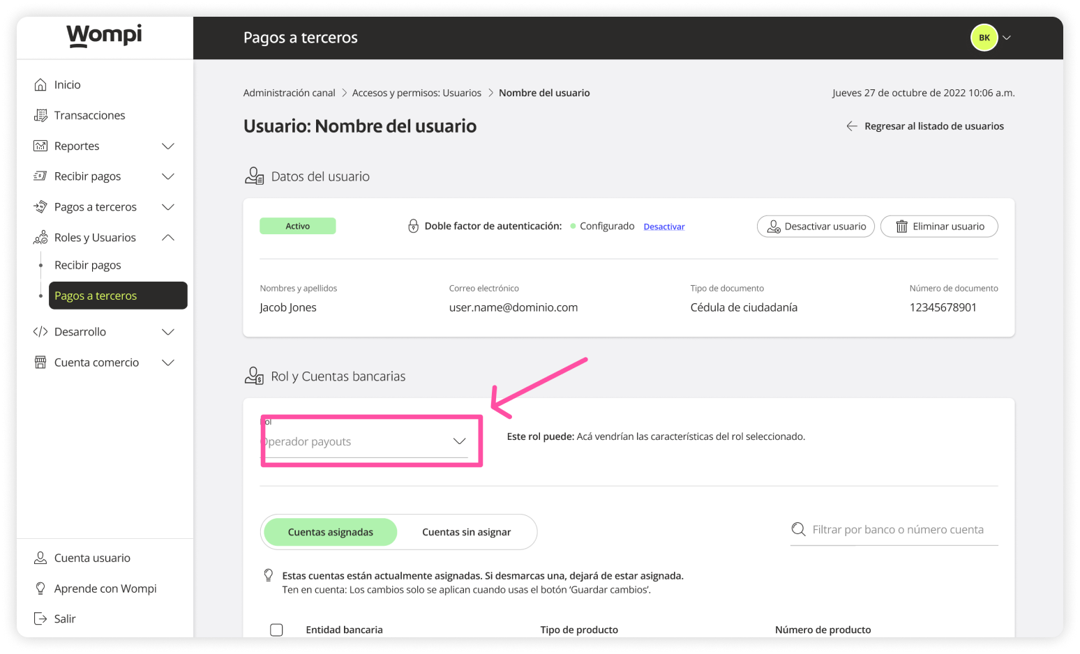 When you access the Wompi dashboard, open the Roles and Users section from the left menu and select the Payouts option.