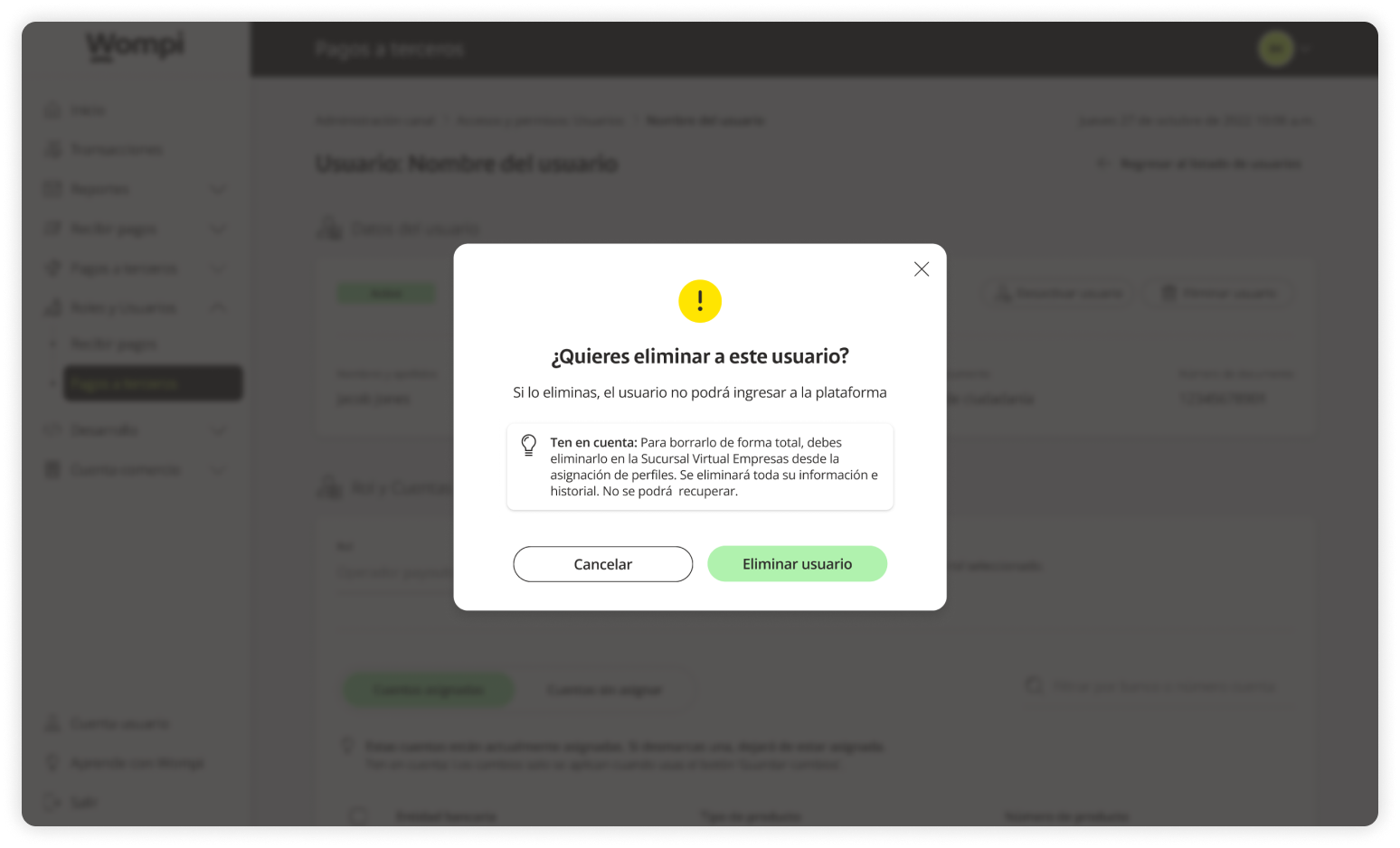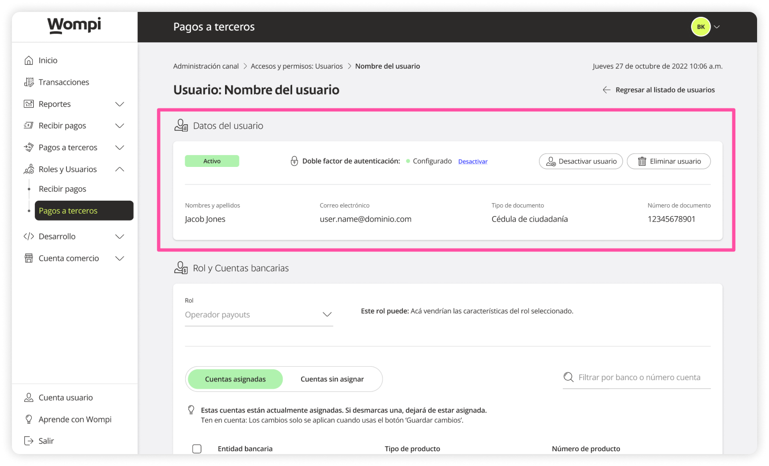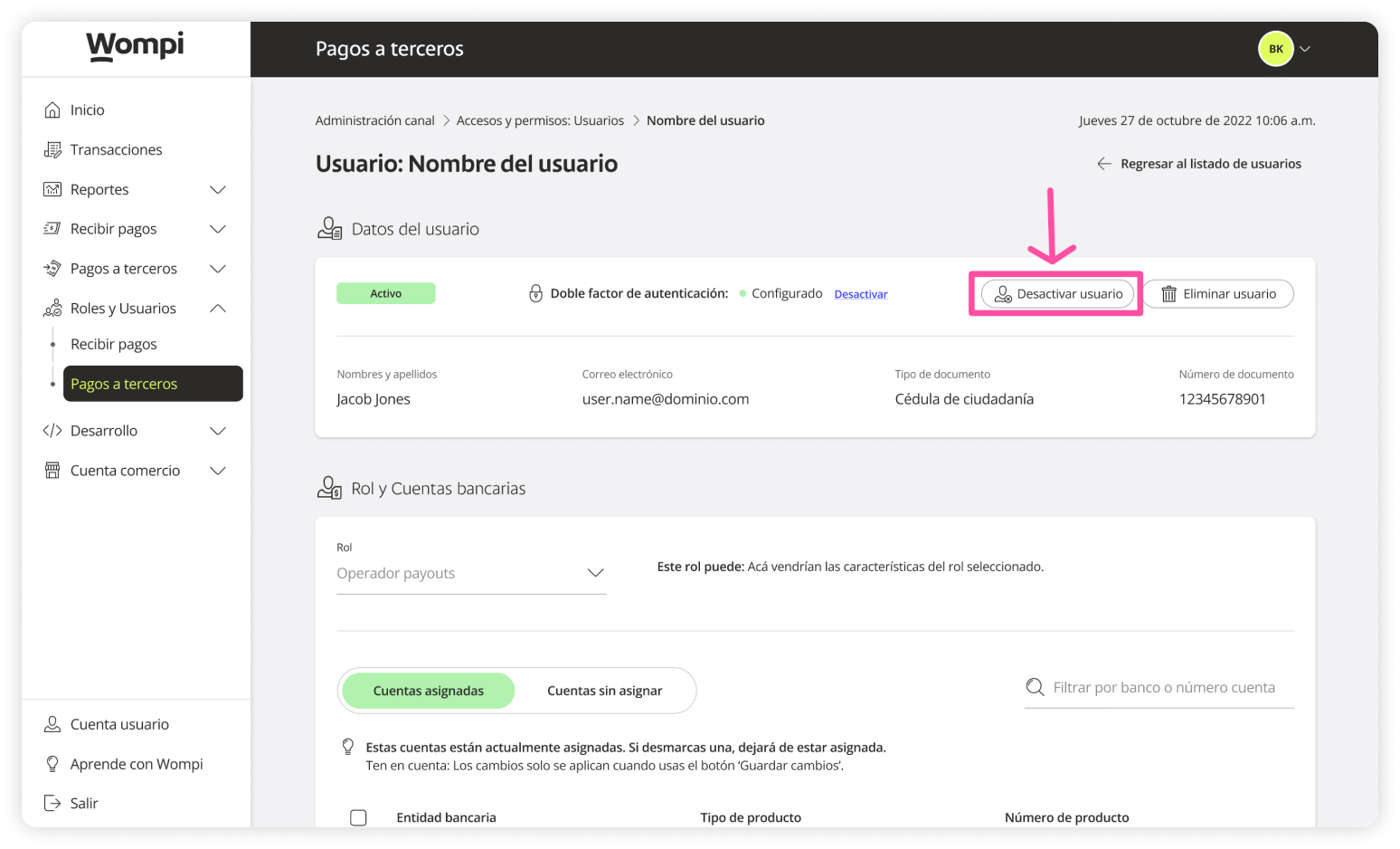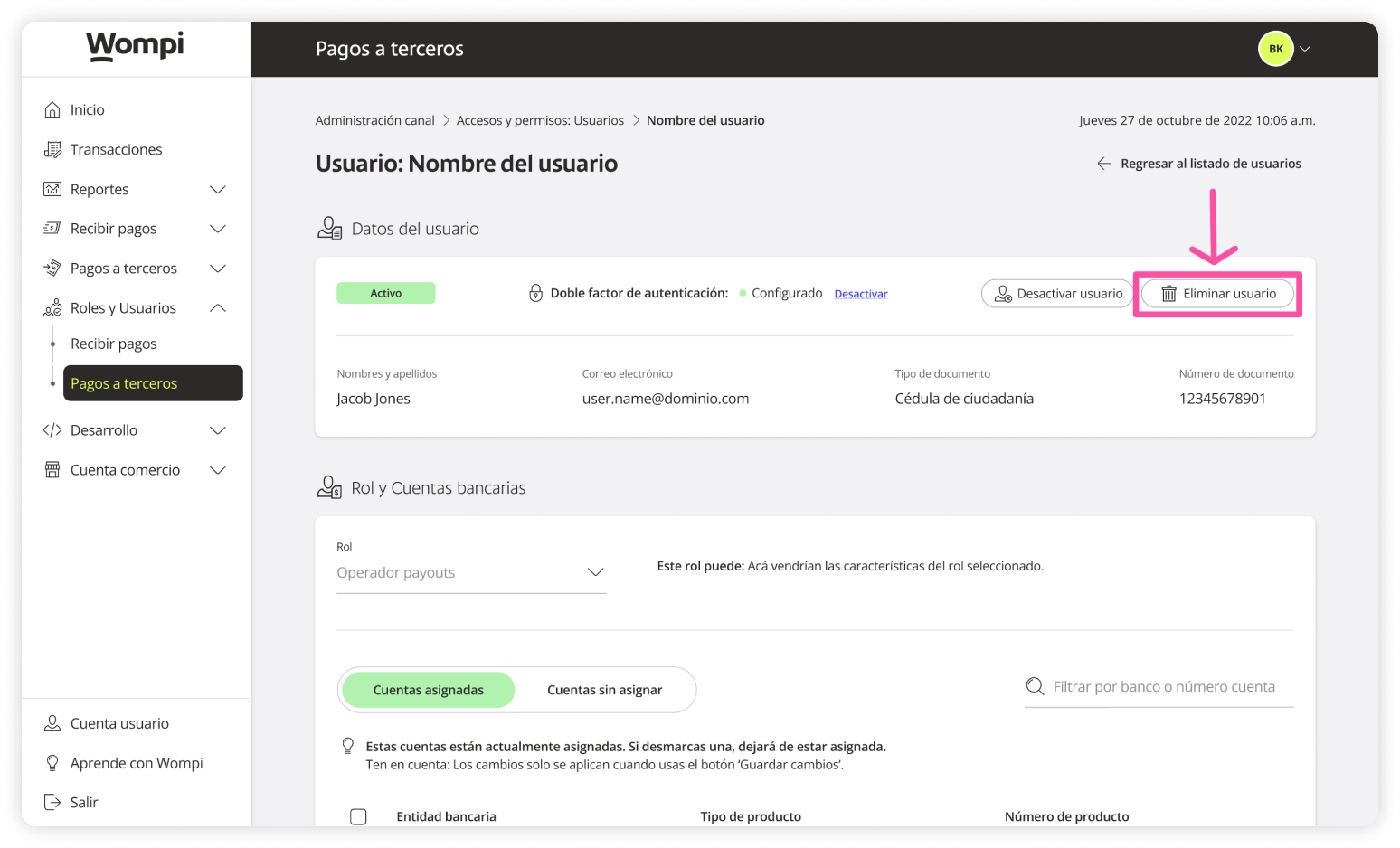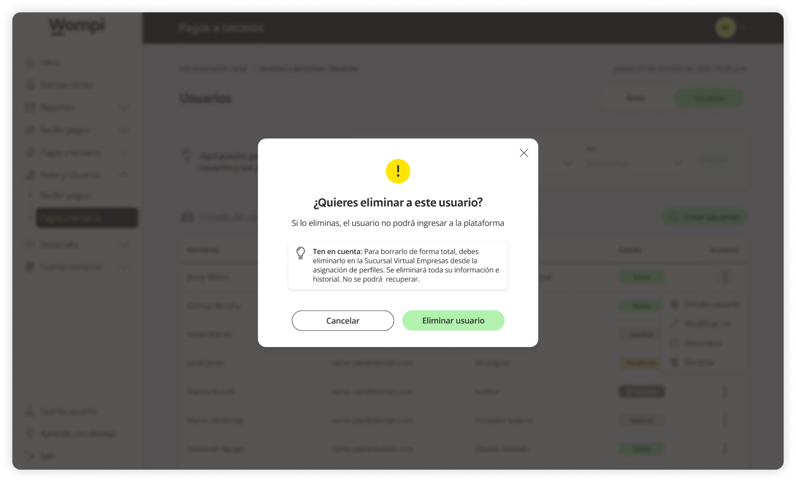 When you access the Wompi dashboard, open the Roles and Users section from the left menu and select the Payouts option.
