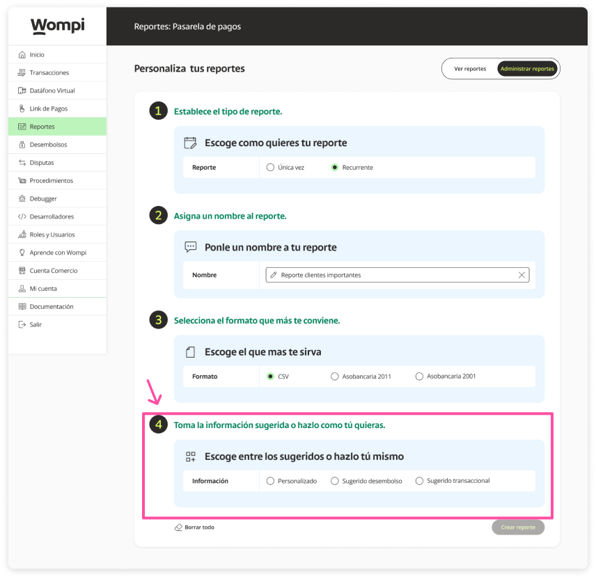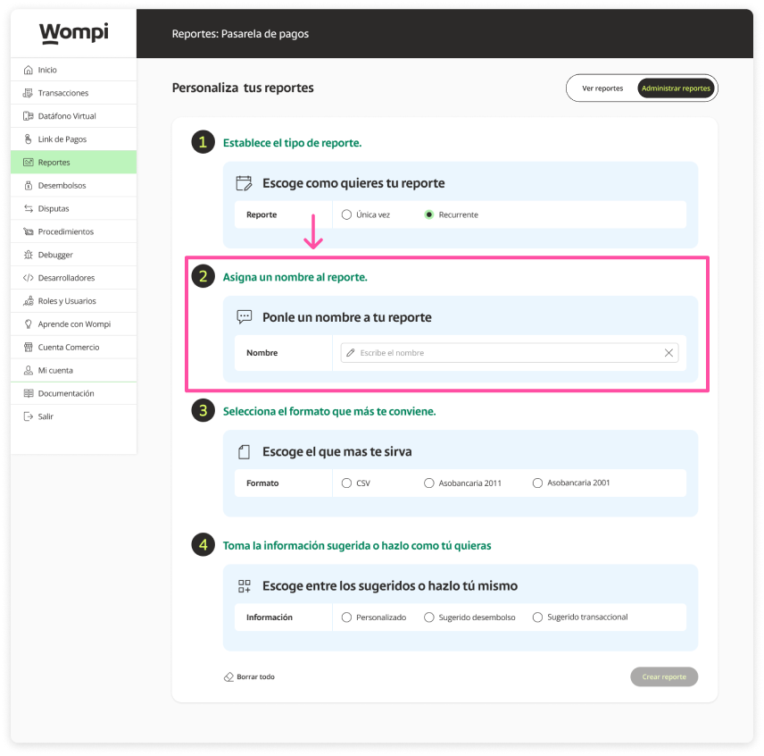 You will be enabled (steps 2 - 3 - 4), where you can select the corresponding information, continue with step 2 assigning a name to the report.