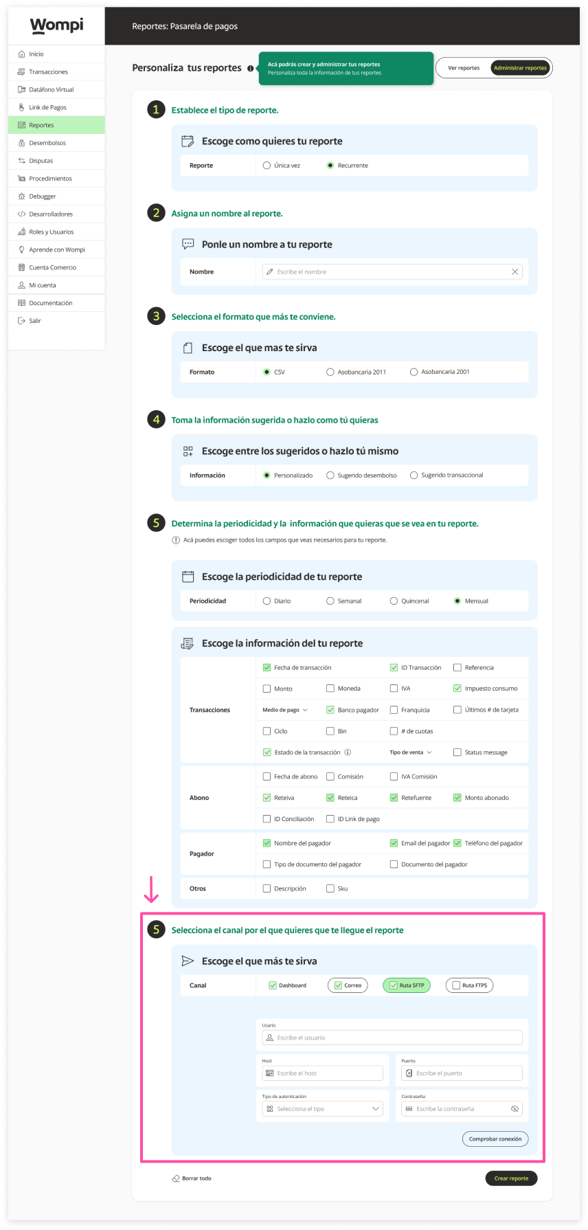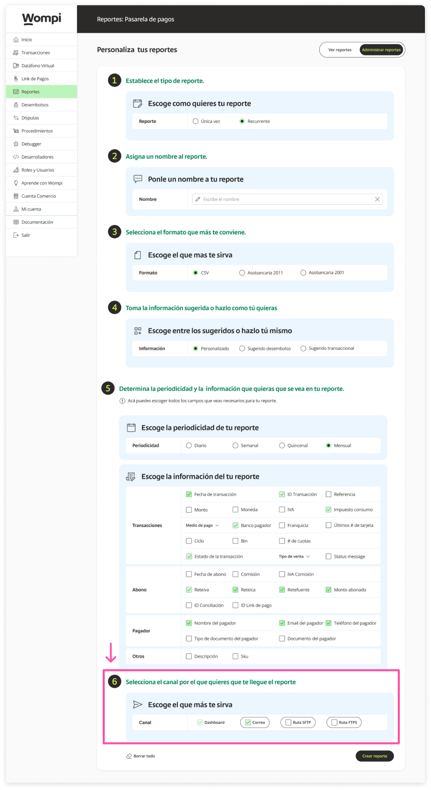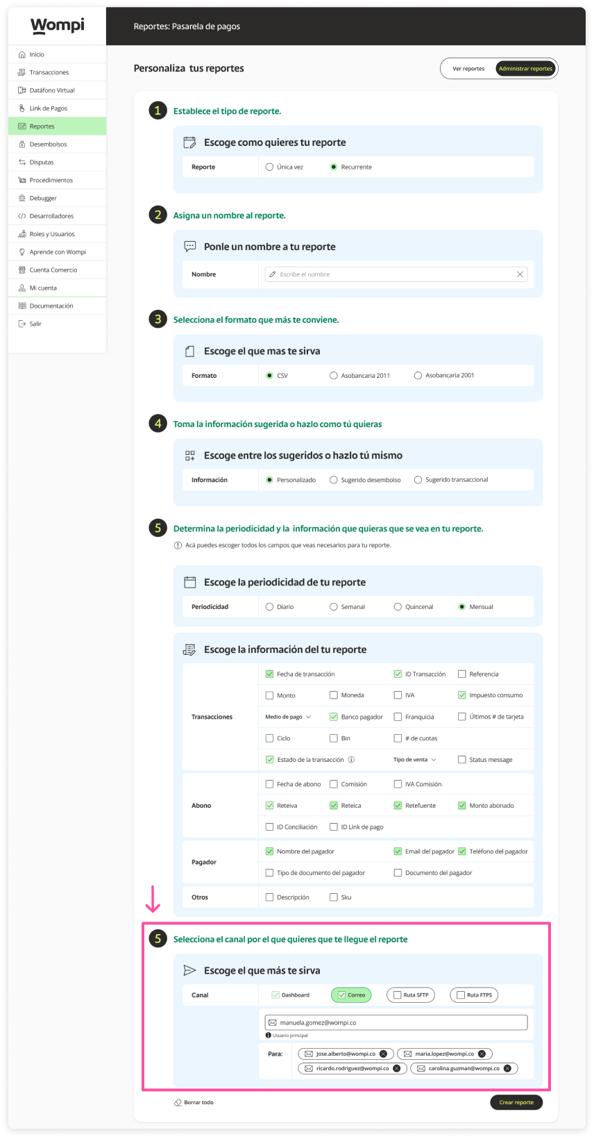 Select the channels through which you want the report to reach you. By default, the dashboard and main email of the business are already selected, you can add more emails so that the report reaches them and also configure SFTP and FTPS routes.