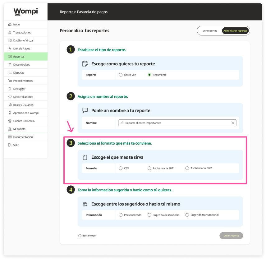 Keep in mind: If you select any Asobancaria format, it will automatically mark the information corresponding to this format. If you choose CSV format you will be able to customize the information for the report.